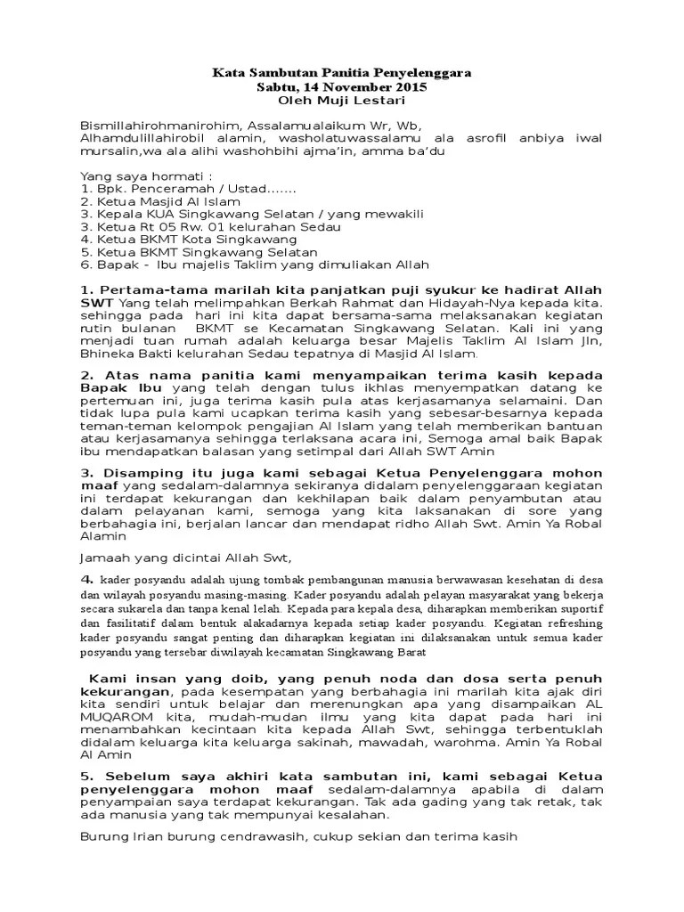 Dan bagi anda yang diminta untuk memberikan kata sambutan, berikut ini kami akan memberikan beberapa contoh 17 agustus arisan isra miraj kantor karang taruna khitanan maulid natal olahraga osis pelantikan pemilu pengajian.